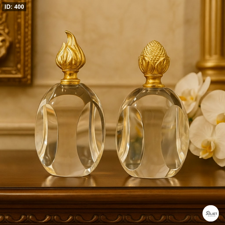 طقم فاخر مكوّن من قطعتين من الكريستال الشفاف النقي مع أغطية ذهبية أنيقة بتصميم ملكي مميز، يمنح المكان لمسة فخامة راقية ويعكس ذوقًا عاليًا في اختيار الديكور.