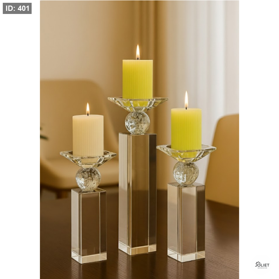 أضف لمسة فخامة وأناقة ساحرة إلى ديكور منزلك مع طقم الشمعدانات الكريستال بثلاثة أحجام مختلفة، المصمم ليعكس الضوء بطريقة رائعة ويمنح المكان أجواء دافئة وراقية.