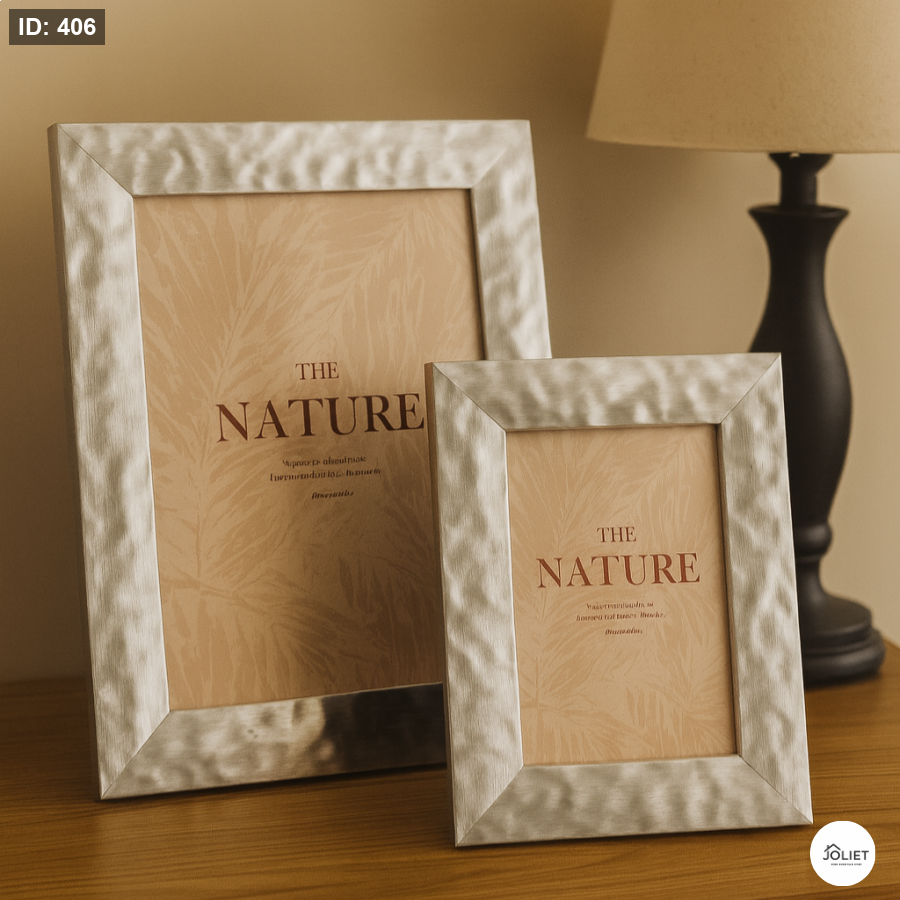 برواز أنيق بلون فضي فاخر مع ملمس مطروق ناعم يعطي انعكاس ضوئي جميل، مثالي لعرض صورك وذكرياتك بأسلوب راقٍ يضيف لمسة فخامة لأي مساحة.