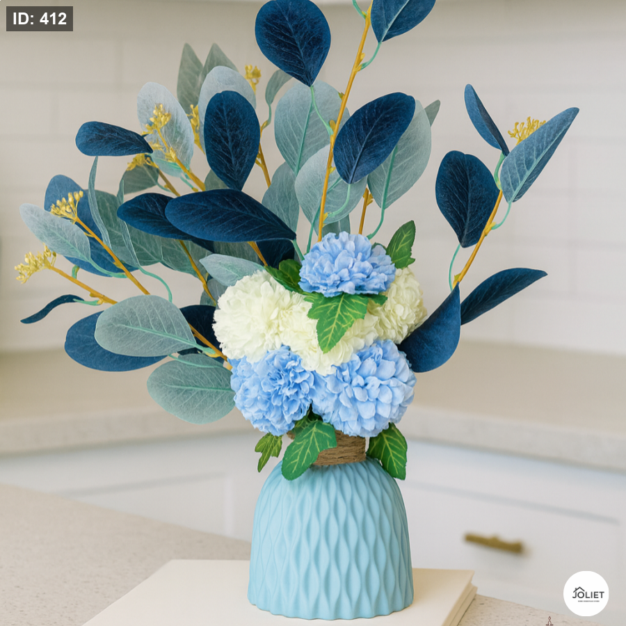 فازة ديكور أنيقة باللون الأزرق الهادئ، مزينة بباقة ورد صناعي فاخرة تجمع بين الأزرق الفاتح والأبيض مع أوراق داكنة أنيقة، لتمنح المكان لمسة عصرية راقية تنبض بالحياة والهدوء في آنٍ واحد.