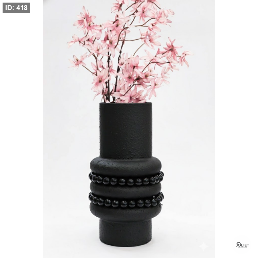 فازة بتصميم قوي وفخم مصنوعة من رخام أسود مطفي مع سلسلة خرز خشبي أسود لامع تضيف تباينًا أنيقًا ولمسة ديكور جريئة تناسب المساحات العصرية الفاخرة.