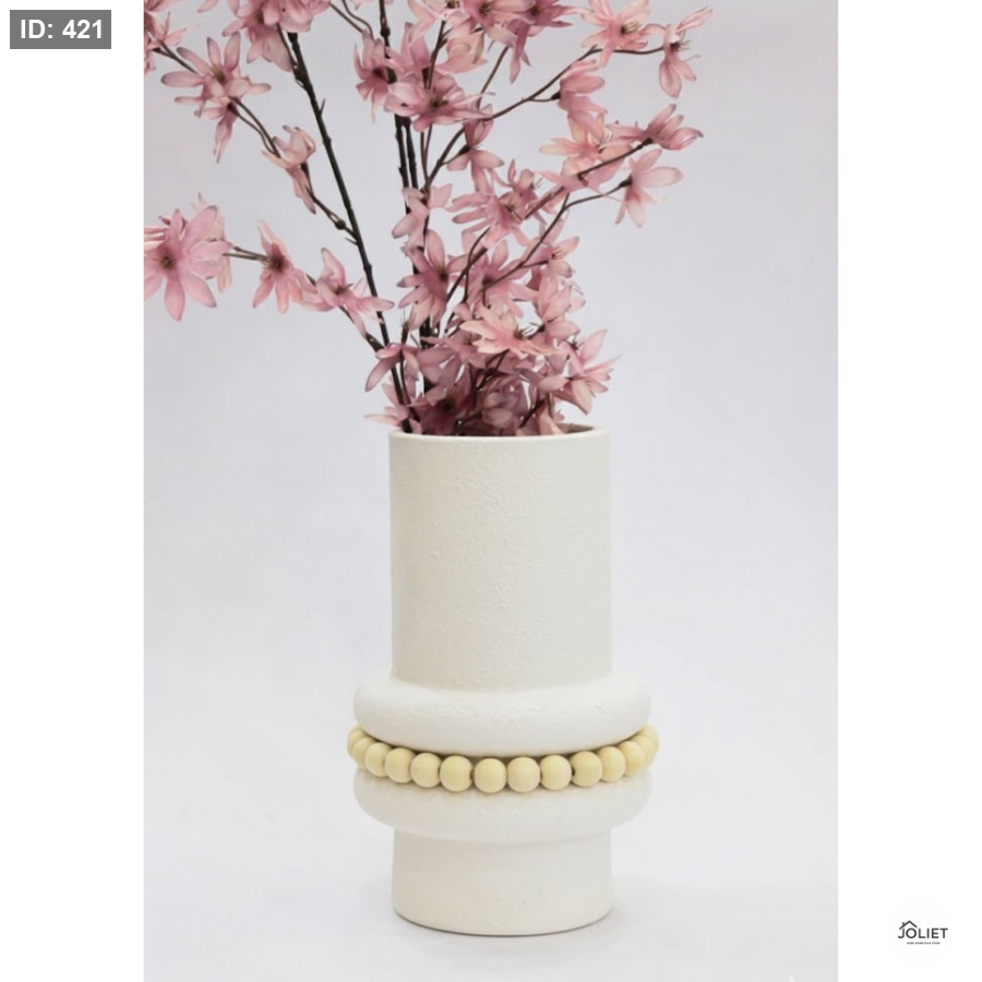 فازة بتصميم هادئ وفاخر مصنوعة من رخام أبيض مطفي مع سلسلة خرز خشبي بلون طبيعي تضيف لمسة دافئة تجمع بين البساطة والفخامة، وتناسب جميع أنماط الديكور العصري والكلاسيكي.