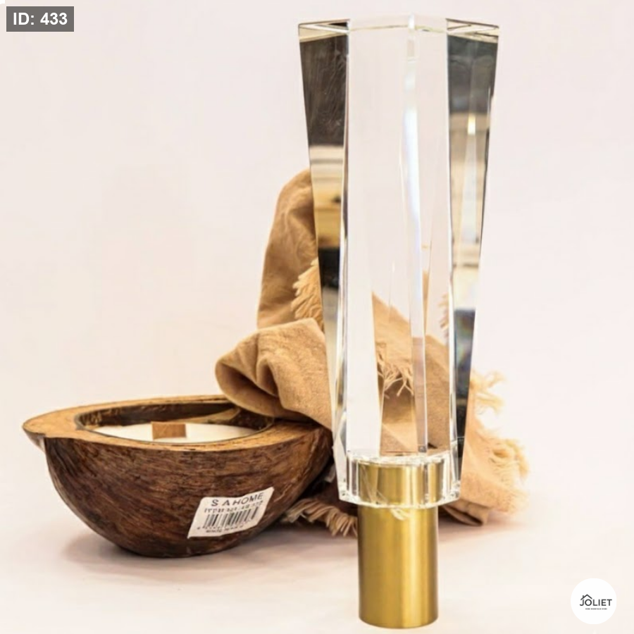 تحفة ديكور راقية بتصميم هرمي عصري من الكريستال الشفاف، مثبتة على قاعدة ذهبية أنيقة تضيف لمسة فخامة ولمعان راقٍ لأي مساحة في منزلك أو مكتبك ✨