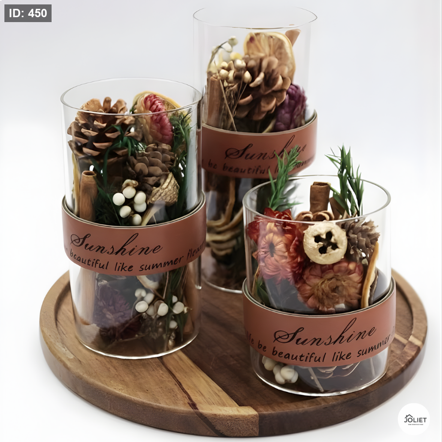طقم ديكوري فاخر من ثلاث زجاجات شفافة بأحجام مختلفة، مزينة بورود وأعشاب طبيعية مجففة بعناية، مع قاعدة خشبية أنيقة. تصميم يجمع بين الدفء الطبيعي والفخامة العصرية ليمنح أي مكان لمسة راقية ومريحة.