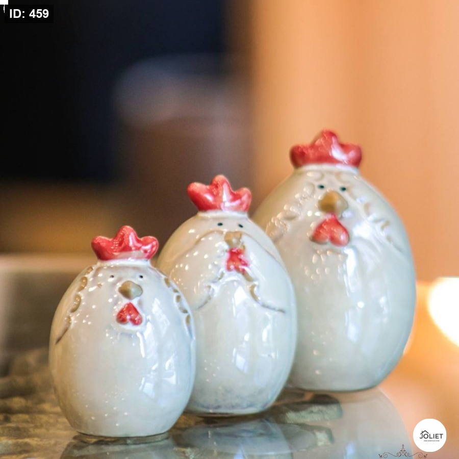 طقم تحف أنيق مكوّن من ثلاث قطع على شكل ديك، بتصميم ناعم وألوان هادئة تضيف لمسة ريفية دافئة وفخامة بسيطة لأي ركن في المنزل.