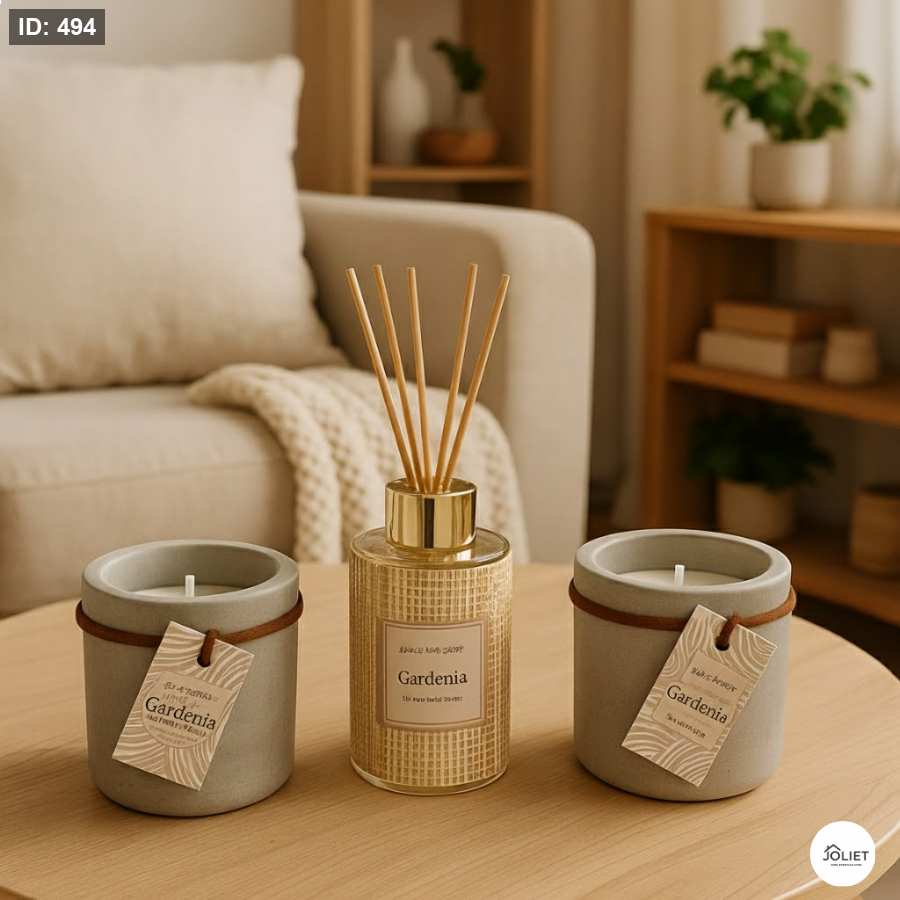 🌿🕯️ بكج معطر عيدان مع شموع – رائحة جاردينيا (Gardenia)