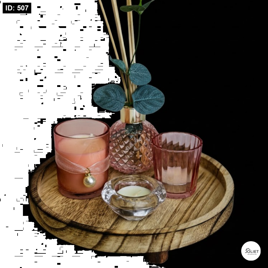 طقم ديكور عطري أنيق يجمع بين قاعدة خشبية دائرية طبيعية ومعطر عيدان بتصميم زجاجي فاخر مع إكسسوارات شموع، ليمنح المكان رائحة ناعمة وأجواء دافئة بلمسة راقية تناسب كل الأذواق.