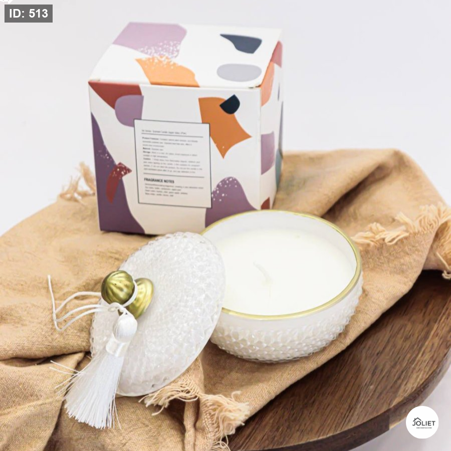 شمعة أنيقة بتصميم السكرية الكلاسيكي باللون الأبيض الناعم، تعكس البساطة والفخامة في آنٍ واحد. تأتي بعلبة جميلة مع غطاء مزخرف وتفاصيل راقية، لتكون قطعة ديكور مثالية تضيف لمسة هادئة وأنيقة لأي مساحة في المنزل.