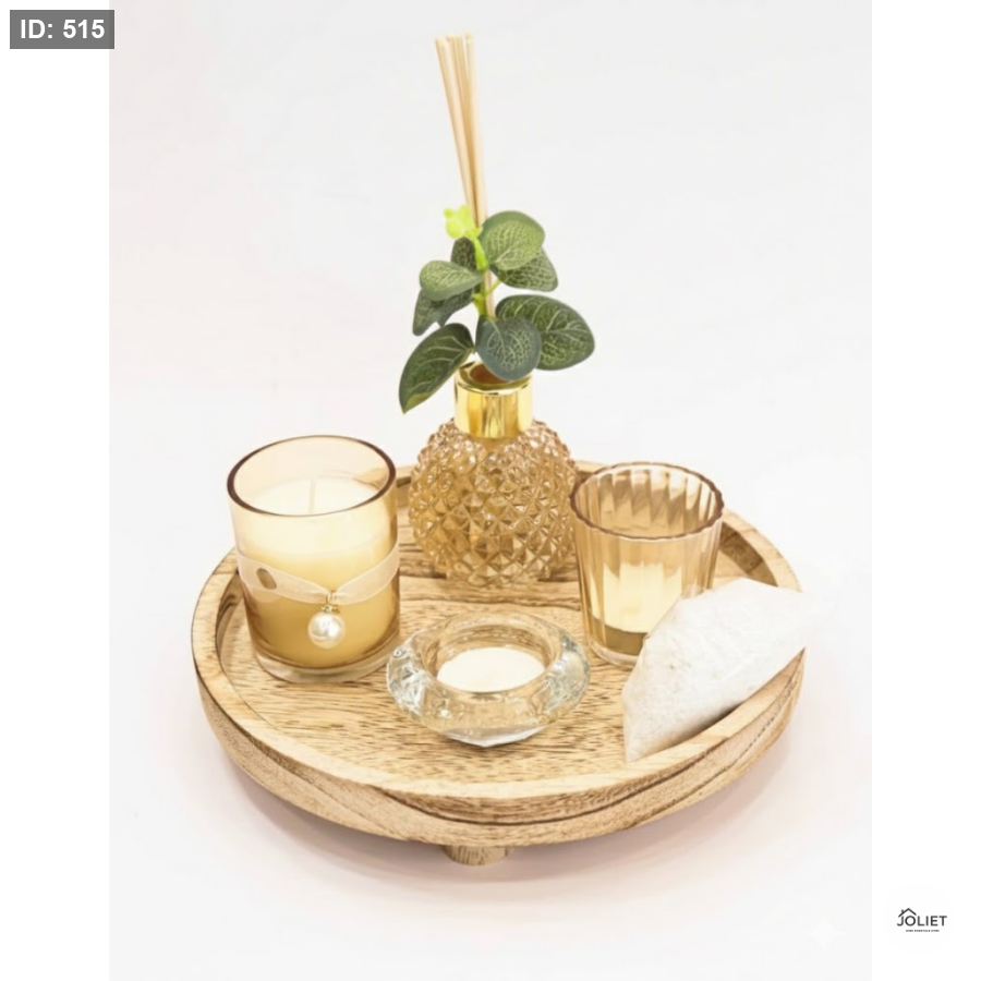 طقم ديكور متكامل بتصميم أنيق يجمع بين الشموع، معطر العيدان، وحجر الزينة (الرمل) على قاعدة خشبية طبيعية. يمنحك أجواء دافئة ولمسة فخامة هادئة، مثالي لتزيين طاولة القهوة، الزوايا، أو الحمام.