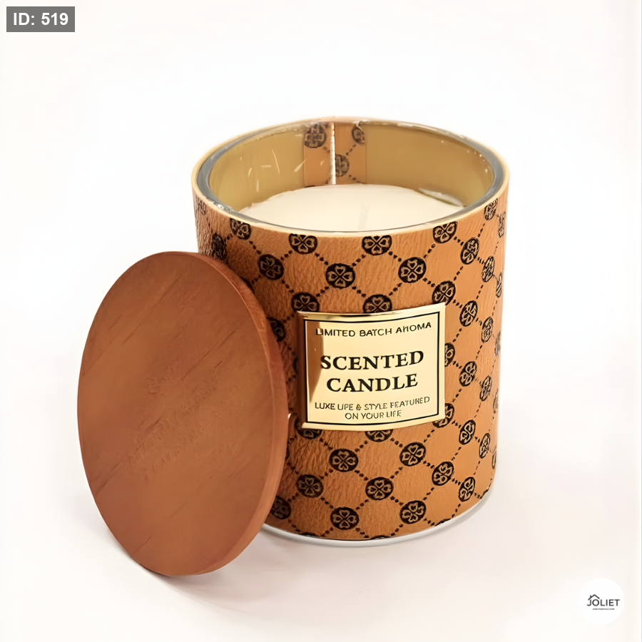 شمعة فاخرة بتصميم أنيق مغطّى بجلد راقٍ مع غطاء خشبي عملي، تجمع بين الشكل العصري والرائحة الاستوائية المنعشة لتمنح المكان أجواءً دافئة ومليئة بالحيوية.